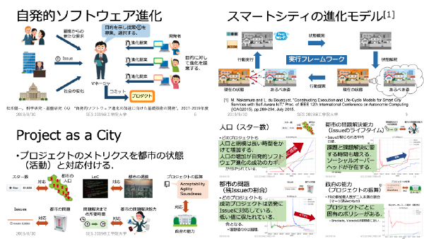 :speaking_head: Overview # Social coding platforms (SCPs) have realized spontaneous software evolution, where new source code and ideas are spontaneously proposed by altruistic developers. Although there are many projects operated by active communities performing spontaneous evolution, it is yet unclear that how such successful projects and communities have been formed and governed. In this paper, we propose a method that can investigate the history of every project in the SCP. Introducing the concept of project as a city, we consider every project in the SCP as a city, where a government and citizens develop a city through collaborative activities. We then identify essential attributes that characterize a state of a city. For each attribute, we develop metrics that quantify the state $S(p,t)$ of a project $p$ at time $t$. An experimental evaluation investigating GitHub projects of famous code editors shows that the proposed metrics well visualize the history of the projects from essential perspectives of a city.