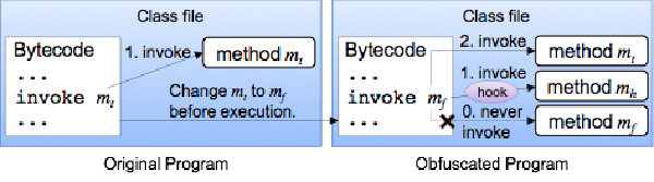 :speaking_head: Overview # This paper proposes an obfuscation method against illegal analysis. The proposed method tries to build a fake call flow graph from debugging tools. The call flow graph represents relations among methods and helps understanding of a program. The fake call flow graph leads misunderstanding of the program. We focus on a hook mechanism of the method call for changing a callee. We conduct two experiments to evaluate the proposed method. First experiment simulates attacks by existing tools: Soot, jad, Procyon, and Krakatau. The Procyon only succeeded decompilation, the others crashed. Second experiment evaluates understandability of the obfuscated program by the hand. Only one subject in the nine subjects answered the correct value. The experiments shows the proposed method has good tolerance against existing tools, and high difficulty of understanding even if the target program is tiny and simple program. (Abstract from IJSI 2015)