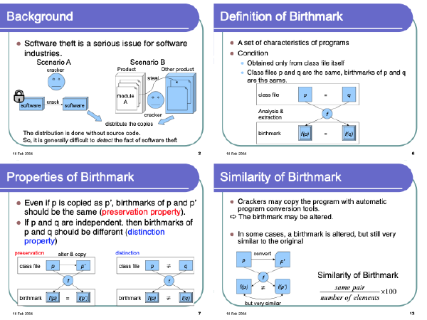 :speaking_head: Overview # This paper presents a technique of dynamic software birthmarks to support efficient detection of software theft. A dynamic birthmark $f(p, I)$ is a set of unique and native characteristics of a program $p$, obtained by executing $p$ with a given input $I$. For a pair of software $p$ and $q$, if $f(p, I) = f(q, I)$ holds, $q$ is suspected as a copy of $p$. In this paper, we propose two kinds of dynamic birthmarks, EXESEQ and EXEFREQ which use execution order and frequency distribution of runtime API Calls. In the first experiment, we applied the proposed birthmarks to the same-purpose applications. As a result, it was shown that an application and its extended version have quite similar birthmarks, and that the applications that are independently implemented possess significantly different birthmarks. The second experiment showed that the proposed birthmarks achieve the strong resilience against the usage of different compilers and optimizations.
