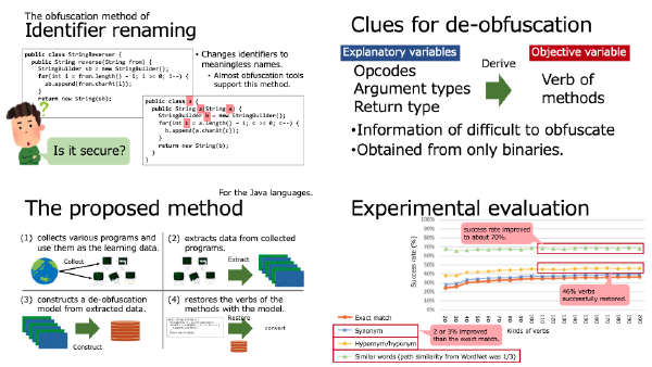 :speaking_head: Overview # The obfuscation methods are often used to hide sensitive information in software. Especially, an identifier renaming method (IRM) is well used because it is easy to implement. IRM is one of the obfuscation methods, and to change the names of function, and variables into meaningless one. However, if we can restore the identifiers to the original names, IRM is invalidated. One of the serious problems about IRM is that the tolerance against de-obfuscation is not discussed. This paper tries to de-obfuscate IRMed programs. Thereby, this paper evaluates the tolerance and effectiveness of IRM. From the experimental evaluation, the proposed method can restore the 49.71 % of method names to the original verbs. Furthermore, focusing on the meanings of verbs, the proposed method recommends the verbs of similar meanings to the original verbs in 57.01 % of methods.